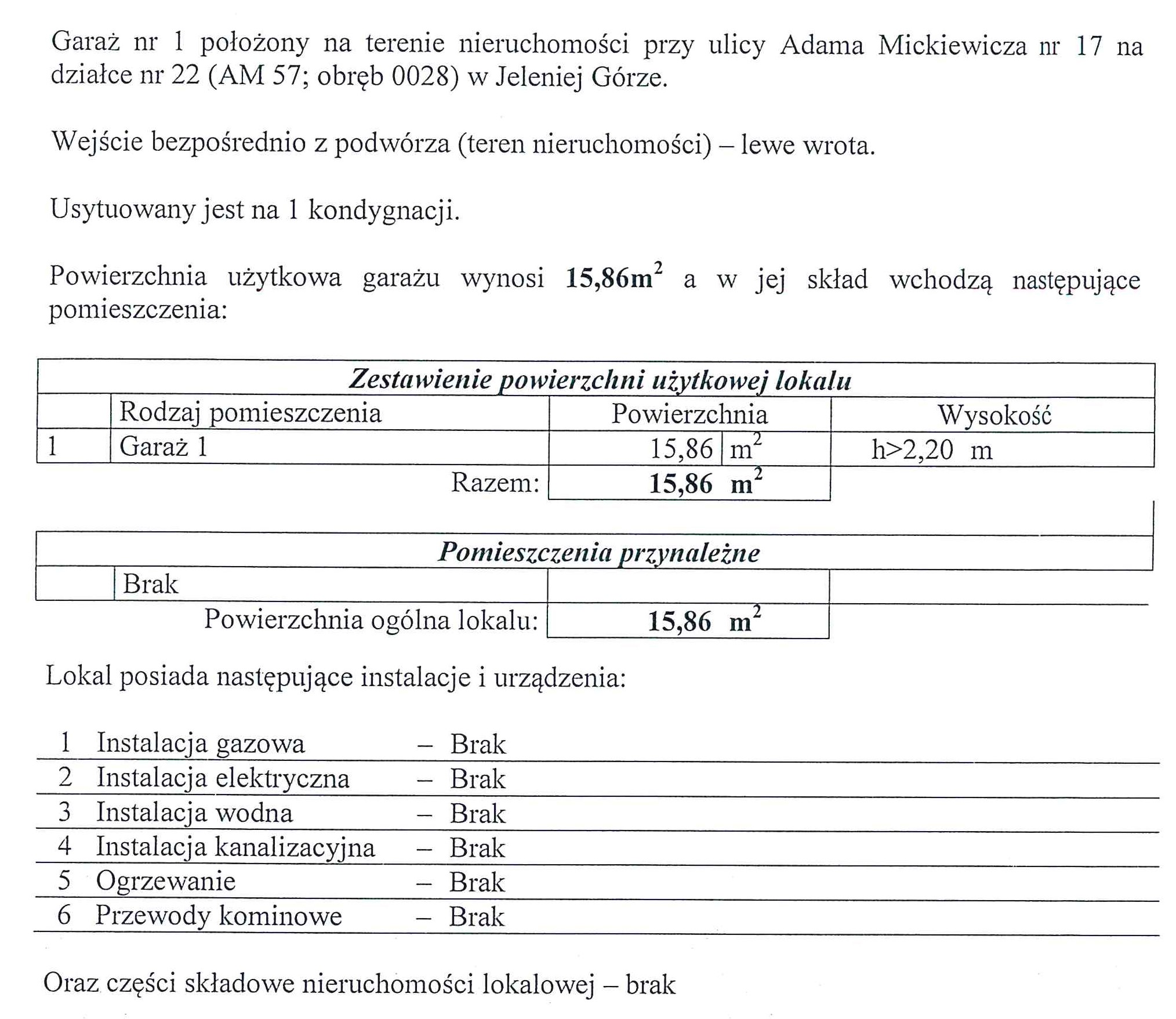 Lokal użytkowy - garaż nr 1 położony przy ul. Mickiewicza nr 17 o powierzchni wynoszącej 15,86 m2